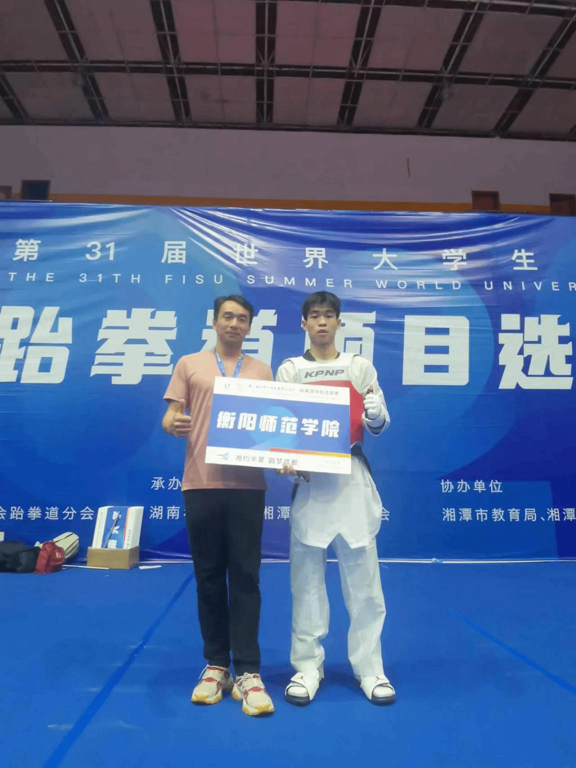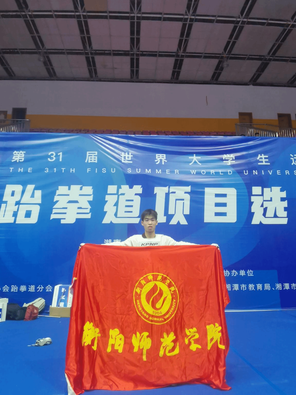 5月14日-18日,由中国大学生体育协会主办(隶属教育部)、中国大学生体育协会跆拳道分会执行的第31届世界大学生夏季运动会跆拳道项目选拔赛,在湖南科技大学举行。yl8cc永利官网2020级运动训练专业学生刘磊经过多轮苦战,终获男子跆拳道竞技-54公斤级比赛冠军,并获得7月成都举办的世界大学生夏季运动会参赛资格。