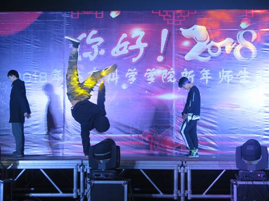 晚会在Devil乐队暖场歌曲中开场。yl8cc永利官网胡建忠院长发表了热情洋溢的新年祝辞。在四位主持人热情洋溢的解说下,十六个节目徐徐展开,有栩栩如生的舞龙舞狮,活力四射的啦啦操表演,酷炫劲爆的街舞、刚柔并济,豪情万丈的跆拳道表演,深情性感的伦巴等,可谓好戏连台,百花争艳,群演“荟”萃,中间穿插着激动人心的游戏环节。还有蒋炳宪教授父子的乐器表演,陈铖副书记和蒋敏同学,以及辅导员彭伟家和崔亚杰老师的倾情演唱更是带嗨了整场晚会的气氛。