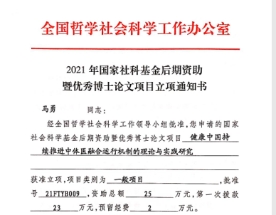 2021年10月,全国哲学社会科学工作办公室发出公告,按照《国家社会科学基金管理办法》有关规定,将2021年度国家社科基金后期资助暨优秀博士论文出版项目立项名单予以公示。经公示,yl8cc永利官网教师马勇博士课题《健康中国持续推进中体医融合运行机制的理论与实践研究》正式获批一般项目立项。