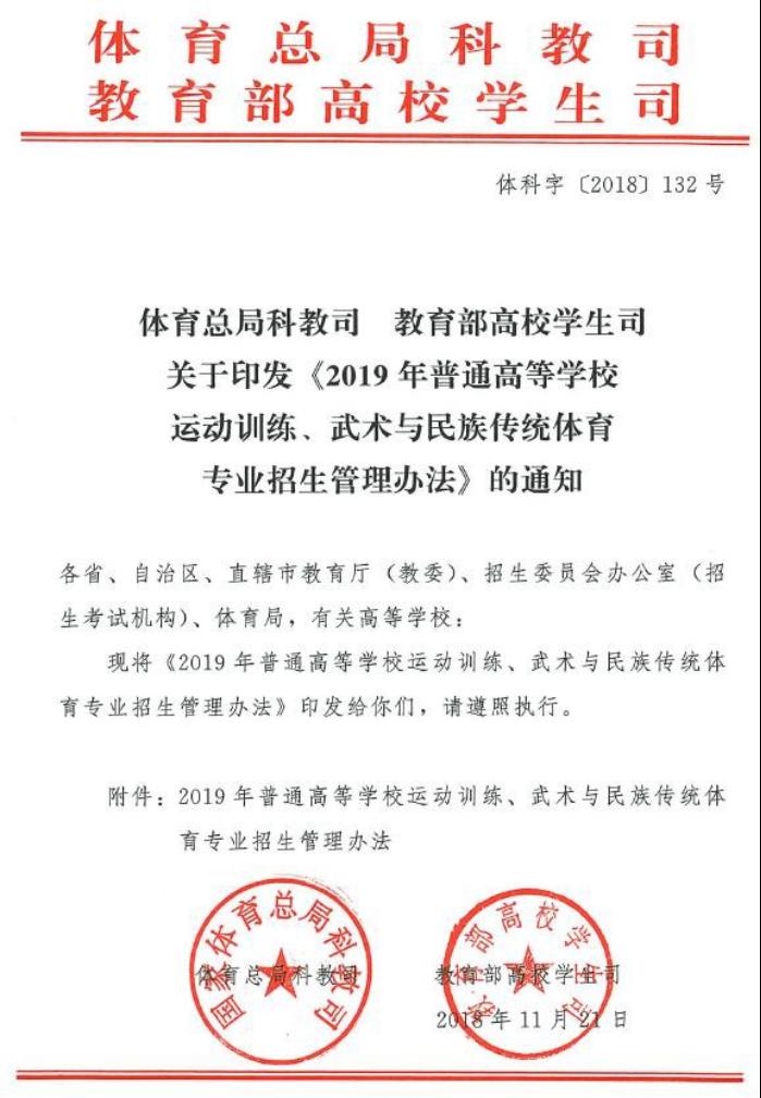 第二十三条办理录取手续前,招生院校必须将《2019年运动训练、武术与民族传统体育专业录取新生名册》、招生计划批复文件和正式印发的招生简章等有关材料按规定报国家体育总局科教司备案。