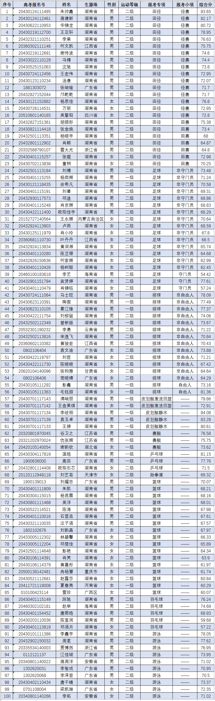 根据国家体育总局科教司和教育部高校学生司联合下发的《2020年普通高等学校运动训练、武术与民族传统体育专业招生管理办法》(体科字[2019]155号)、国家体育总局司局《2020年普通高等学校运动训练、武术与民族传统体育专业招生管理办法操作细则》(体科字[2019]134号)、《yl8cc永利官网2020年运动训练专业招生简章》等文件精神,结合学校人才培养要求和体育学科建设与竞赛需求,按照公平公正公开、择优录取原则,我校确定了2020年运动训练专业拟录取名单,现予以公示。
