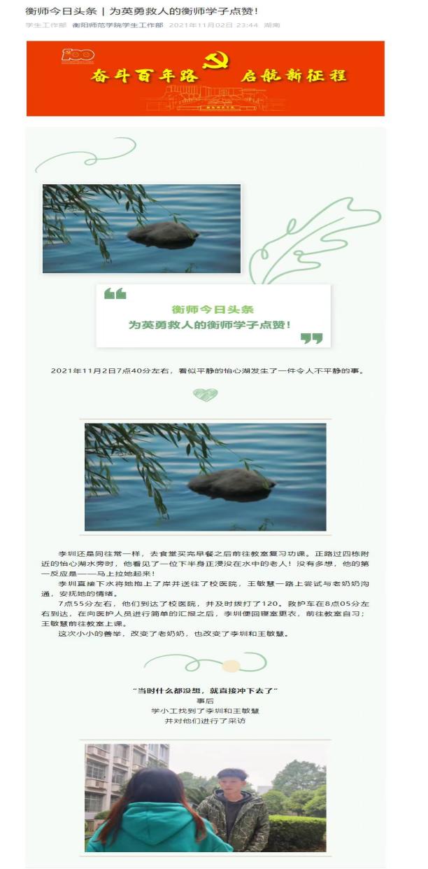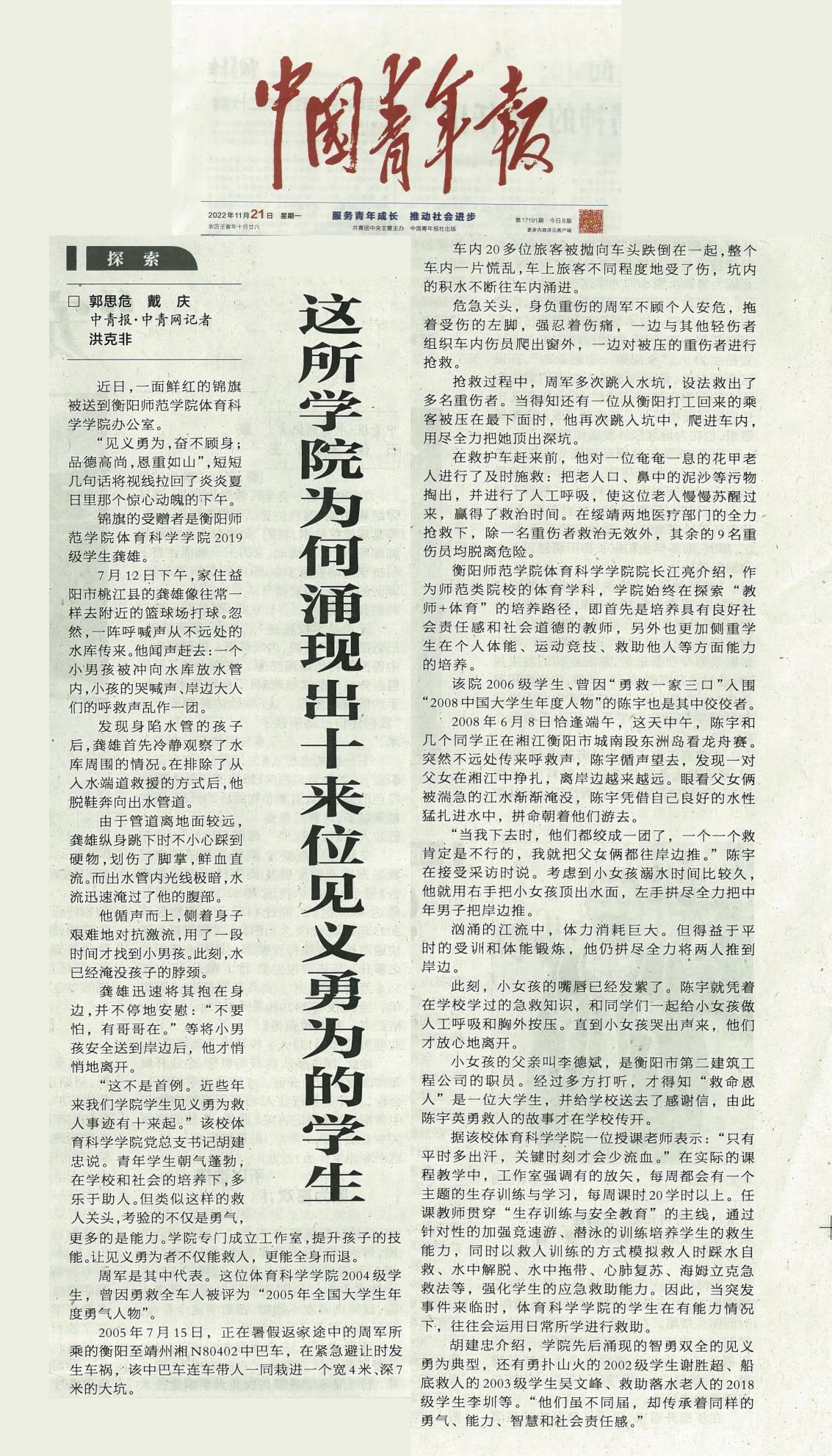 培树榜样标杆“领航”。yl8cc永利官网积极推进“三全育人”综合改革,认真落实“全员育人、全程育人、全方位育人”理念,注重发挥优秀典型的引领示范作用,营造向善向上的育人氛围。 一是充分发挥学生党员的先锋模范带头作用。推进学生党支部建设,落实落细“三会一课”制度,加强党员教育管理,引导党员做到“平常时候看得出来、关键时刻站得出来、危急关头豁得出来”。二是选树一批优秀典型。在学院严格的教育和训练下,学生见义勇为的壮举蔚然成风,形成了独特的“衡师现象”,先后涌现出勇救全车人的“全国大学生年度勇气人物”周军、勇救落水一家三口的“中国大学生年度人物”“湖南省优秀学生党员”陈宇,以及勇扑山火的学生谢胜超、船底救人的学生吴文峰、救助落水老人的学生李圳、勇救落水学生的龚雄等见义勇为典型,受助人的锦旗和感谢信源源不断送到学校。三是营造学习榜样争当榜样深厚氛围。坚持以榜样力量行育人之本,通过举行隆重的表彰仪式、把他们的先进事迹编印成册、举办先进事迹报告会、设立光荣榜、在各类媒体上报道等鲜活形式,广泛宣传他们的先进事迹,让他们的英雄义举无时无处不在影响身边人,让他们勇气、能力、智慧和社会责任感得以代代传承。