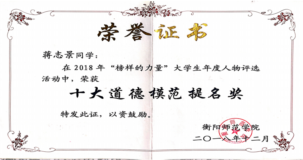 蒋志景,2016级运动训练专业。其曾在学校宿舍英勇救火,成功疏散人群,而被学校授予“十大道德模范提名奖”荣誉证书。2018年6月某天下午,正准备去上课的蒋志景,突然接到当时同班同学的电话,说在宿舍闻到了烧焦的味道。这时的蒋志景听到烧焦这两个字后就联想到了肯定是哪失火了。于是急忙从男生宿舍跑到了女生宿舍,并直接冲上了失火的楼层。由于正值午休,其他同学还处于午睡状态,再加之当天风很大,火情蔓延极其之快。他不顾生命危险,径直冲进火场,冒着浓烟对该层楼所有的宿舍进行了二轮呼喊、敲击以及疏散工作。因为浓烟的吸入,使他自身呼吸困难,但想到浓烟是往上蔓延,而且上面的同学还有很多没有下楼。于是,他又跑到五楼,使用“踹门”这种直接又迅速的方式,对整个五楼进行了逐个宿舍疏散。最终在他的疏散下,整栋楼五层,所有学生全部成功疏散,无人受伤。