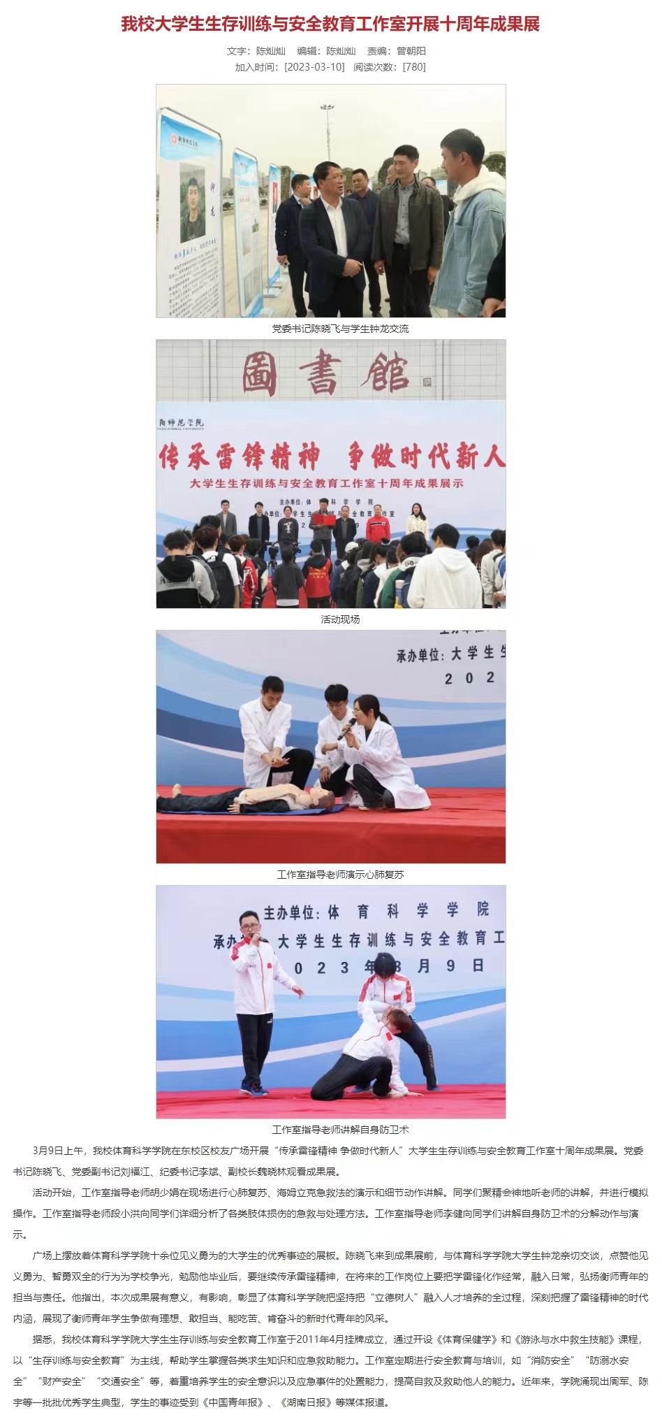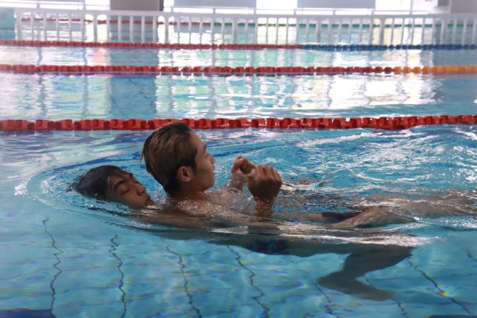 工作室每周都会有一个主题的生存训练与学习,教师贯穿“生存训练与安全教育”的主线,以专题讲座和实习演练为平台,利用课内与课外相结合的方式,开展形式多样的专题教育,结合不同年级、不同专业的实际情况,运用多种途径和载体,坚持不懈地深入开展系列专题教育。此外,工作室也注重将体育专业学习相结合,传授学生学习生存和急救技能,每年定期会开展为期半个月的生存训练课程——游泳课程,通过加强竞速游、潜泳的训练,培养学生的救生能力。同时,依托学院重点专业课程《运动保健学》课上所学基础知识,每学期由指导老师组织学生进行为期一周的急救知识巩固和实操训练。以救人训练的方式模拟救人时踩水自救、水中解脱、水中拖带、心肺复苏、海姆立克急救法等应急救助能力。因此,当突发事件来临时,yl8cc永利官网学生在有能力的情况下往往会运用日常所学进行救助,从而产生了周军、陈宇等一批批优秀学生典型。