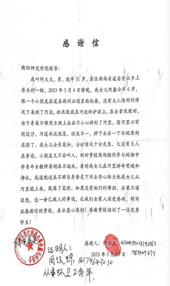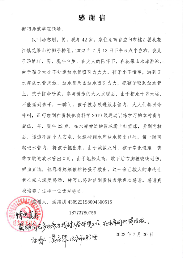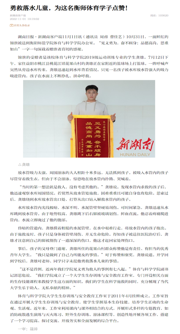 龚雄,2019级体育教育专业学生。其曾在桃江县某一水库水管内救助了一名小男孩,而被新湖南客户端媒体报道做事迹宣传,并收到了来自被求助者家乡委员会——益阳市桃江县桃花江镇花果山村支部委员会,开具的感谢信。2022年7月12日下午,家住桃江县的他还是像往常一样去附近的篮球场打球,一阵呼喊声忽然从不远处的水库传来。龚雄闻声赶到,只见一个小男孩被陷入水库放水管内,龚雄没有一丝犹豫,立即纵身跳入管内,还不小心划伤了自己的脚掌。由于出水管内光线极暗,水深不明,只想救人的他,忍痛朝着管道内半走半游地前进,水流迅速淹过了他的腹部。他跟随着小男孩的哭喊声,逆流而上,艰难地游到小男孩身边时,水已经淹没到了小孩的脖子,他迅速将小男孩抱在身边,并将其安全救出。