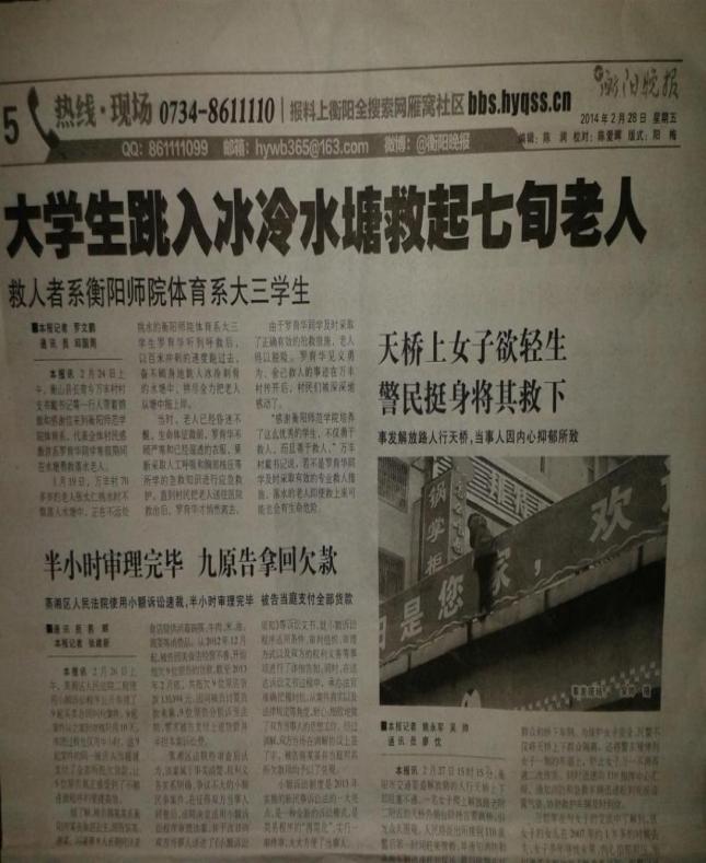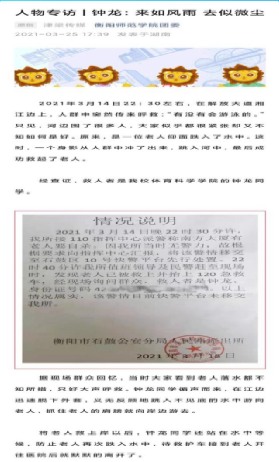 钟龙,2019级体育教育专业学生。其曾在湘江边上救起一位老人,被评为yl8cc永利官网“2020年度十大道德模范”,并收到了来自中共孝感市孝南区陡岗镇白莲村支部委员会开具的一份表扬信,以及衡阳市石鼓区公安局人民路派出所开具的一份关于“钟龙救人”的情况说明。2021年3月14日,在解放大道湘江边上,一位老人仰面跌入了水中,周围聚满了围观群众,但没有人敢下水营救,只能大声呼喊。钟龙同学循声而来,在江边迅速脱下外套,跳入水中营救老人,抓住老人肩膀就向岸边游去,最终将老人成功救上了岸,为防止老人再次跌入水中,待救护车接到老人开往医院后,他才默默离开。此外,其在2020年8月10日,在湖北孝南区的一个小村镇上,他也成功救助了一位骑三轮车翻车至头部受伤、失血昏迷的老人。
