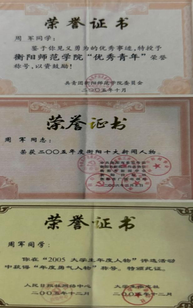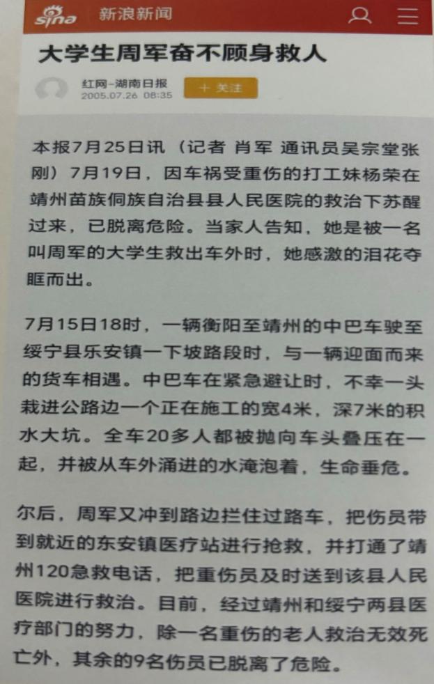周军,2004级体育教育专业学生。其曾因勇救全车人被评为“2005年全国大学生年度勇气人物”,被《湖南日报》、《怀化日报》分别以《大学生周军奋不顾身救人》、《中巴车栽进水坑,大学生带伤救人》为题,进行了专门报道。2005年7月15日,准备暑假返家乡的他,乘坐衡阳至靖州湘N80402中巴车,在紧急避让时发生车祸,该中巴车连车带人一同栽进一个大坑中,车内20多位旅客被抛向车头跌倒在一起,坑内1.5米深的积水不断往车内涌进。在这危急关头,身负重伤的他强忍着伤痛,一边与其它轻伤者组织车内伤员爬出窗外,一边对被压的重伤者进行施救。救出了多名重伤者。最后,在该生的救助和绥靖两地医疗部门的全力抢救下,除一名重伤者救治无效外,其余的9名伤员均脱离危险。