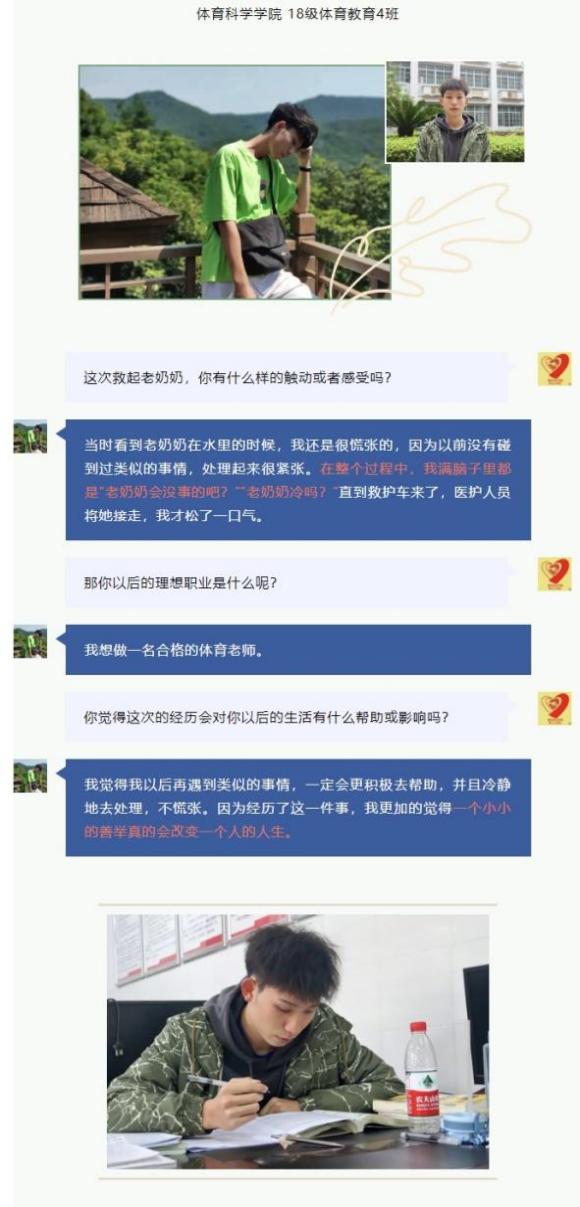 李圳,2018级体育教育专业学生。其曾在学校怡心湖边救起一位落水老人,其事迹得到了学校团委、宣传部的广泛宣传与报道。2021年11月2日上午7点40分左右,李圳同学去食堂买完早餐后准备前往教室复习功课。路过4栋学生宿舍附近的怡心湖水旁时,他看见了一位下半身正浸没在水中并朝着湖心走去的老人!情急之下,李圳没有多想,赶忙跳进湖中,并把老人往岸边推。但是老人并不配合,于是就在岸边给老人做心理疏导工作,劝服老人上岸。因为天气比较冷,李圳同学和老人在水中待了快10分钟。考虑到老人的身体健康,李圳同学直接将老人抱上了岸,并和周边同学一起将老人送进了校医院。