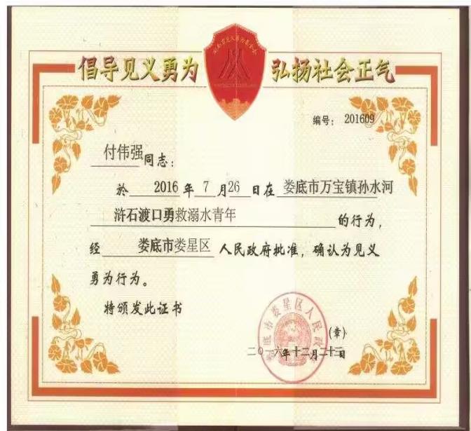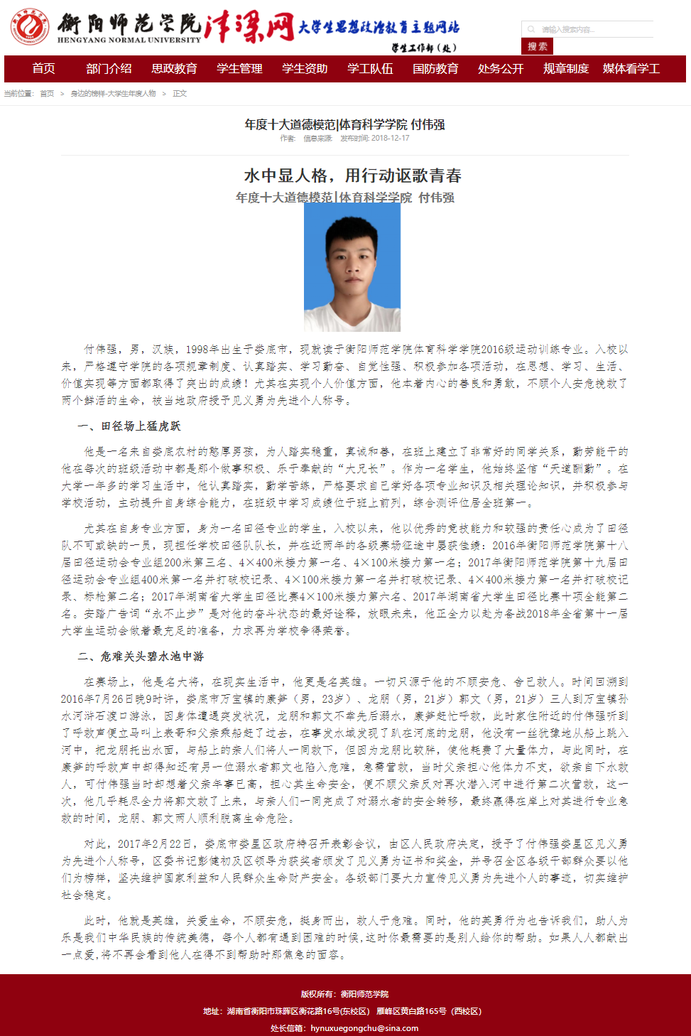 付伟强,2016级运动训练专业学生。其因勇救两名落水青年,被学校评为年度十大道德模范,并被湖南省娄底市娄星区政府授予“见义勇为先进个人”称号,且号召全区各级干部群众向他学习。2016年7月26日晚,娄底市万宝镇的康某、龙某、郭某三人结伴至万宝镇孙水河浒石渡口游泳,因身体遭遇突发状况,龙某和郭某不幸先后溺水。听到了呼救声的付伟强便立马叫上表哥和父亲乘船赶了过去,他在事发水域发现了趴在河底的龙某,他立马就从船上跳入河中,把他拖出水面。因为龙某较胖,耗费了他大量体力。此时,他从康某的呼救声中得知还有另一位溺水者郭某急需营救。付伟强则又再次跳入水中,进行第二次营救,这次他几乎耗尽全力才将郭某救上来。最后,付伟强与亲人们一边施救一边等待救护车赶来,最终为两名青年的获救赢得了宝贵的时间。
