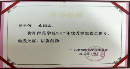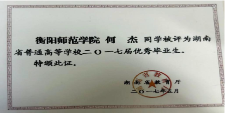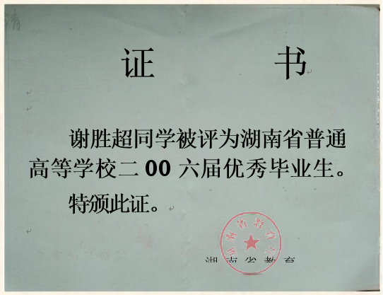 谢胜超同学被评为湖南省普通 高等学校二00六届优秀毕业生。