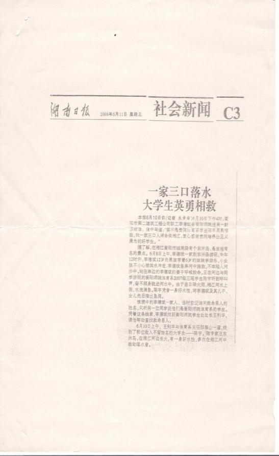 陈宇,2006级体育教育专业学生。其因“勇救一家三口”的先进事迹,获评“湖南省优秀学生党员”等称号,入围“2008中国大学生年度人物”“2008年雁峰区见义勇为先进个人”,其事迹被中青网、湖南日报等多家媒体报道。2008年6月8日中午,陈宇和几个同学正在湘江衡阳市城南段东洲岛看龙舟赛。突然传来呼救声,其循声望去,发现一对父子和一个小女孩在湘江中挣扎,且离岸边越来越远。眼看三人被湍急的江水渐渐淹没,陈宇凭借自己良好的水性猛扎进水中,拼命朝着他们游去。考虑到小女孩溺水时间比较久,他就用右手把小女孩高举出水面,左手拼尽全力先后将男孩和中年男子推上了岸。将三人救上岸后,陈宇凭着在学校学过的急救知识,和同学们一起给小女孩做人工呼吸和胸外按压,最终将女孩从死神手中夺回生命。