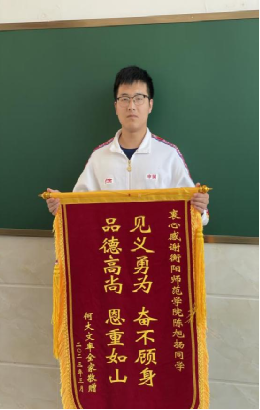 陈旭扬,2019级运动训练专业学生。其曾在永州河滩救起一名小女孩。2023年3月4日傍晚,永州道县潇水河边,一对年轻的情侣正在钓鱼。突然,远处传来小孩的哭声。这对年轻的情侣放下鱼竿,往哭声处跑去。发现河滩对岸一名小女孩在河流中受困,情况十分危险。在这危急时刻,情侣当中的男生——陈旭扬不顾河床里的碎石,脱下鞋袜、挽起裤脚,就快速朝着小女孩那边走去。此时,小女孩哭声不止,陈旭扬将她从水中抱起,并带至岸边安全区域。最后他还及时地联系到了女孩的家长,将女孩送回了家。小女孩家长为感谢陈旭扬同学,为其还特意从其村委会开具了一份感谢信和一面锦旗。