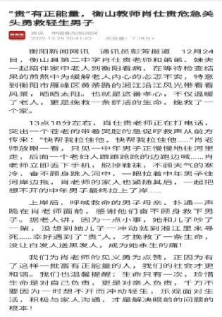 肖仕贵,2002级体育教育专业学生。其毕业后一直扎根在教育一线,因勇救轻生男子被衡阳新闻网报道,浏览量高达7.78万多。2022年12月24日下午,肖仕贵和家人一起陪同岳母到市区看病,为缓解因等待医院检查结果而内心忐忑的岳母情绪,他便提议陪同老人在附近江边散步,正当他们漫步在湘江沿江风光带时,他突然听到一老妇人的呼救声,并看到不远处一中年男子正慢慢地往河里走。其立马意识到情况不妙,立即放下手机、脱掉鞋袜,不顾天气的寒冷,奋不顾身跳入河中,最终和家人一起把想要轻生的中年男子拉上了岸。此外,他还在2021年,危急关头成功救下两名想要轻生的学生。